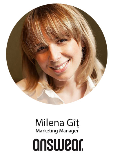 Cu o experienta in e-commerce si in digital marketing de peste 7 ani, pe Milena Git o poti gasi la ANSWEAR.RO ca Marketing Manager. Ca femeie de cariera Milena se descrie ca fiind o persoana asumata, deschisa la minte si care este foarte pasionata de ceea ce face. Apreciaza femeile puternice si care stiu ce isi doresc si lupta pentru a reusi din punct de vedere profesional.