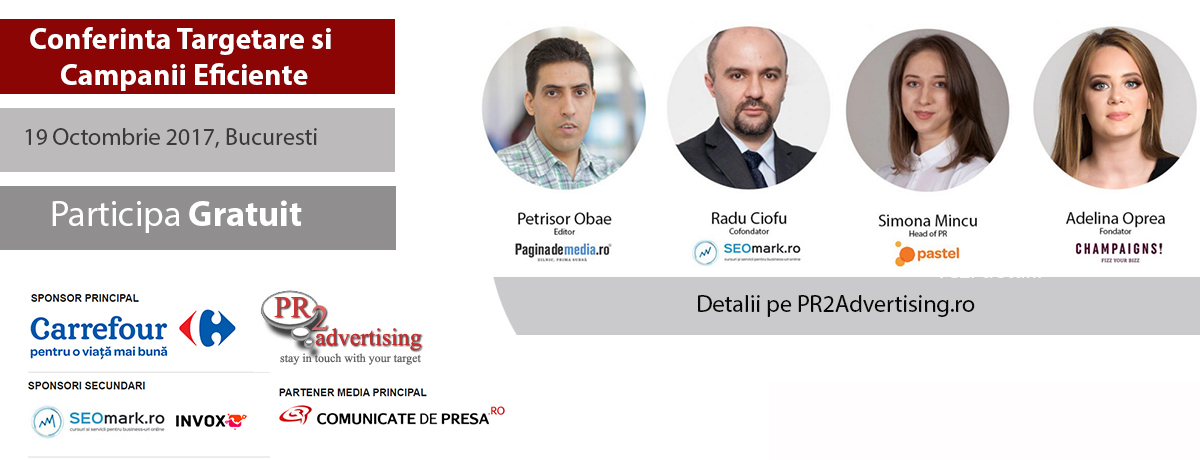 Conferinta “Targetare si campanii eficiente” face parte dintr-o serie de evenimente pe care PR2Advertising.ro le organizeaza cu scopul de a pune in legatura specialisti si reprezentati ai unor companii de top cu persoane interesate de tot ceea ce inseamna PR, advertising, marketing si promovare online si offline.